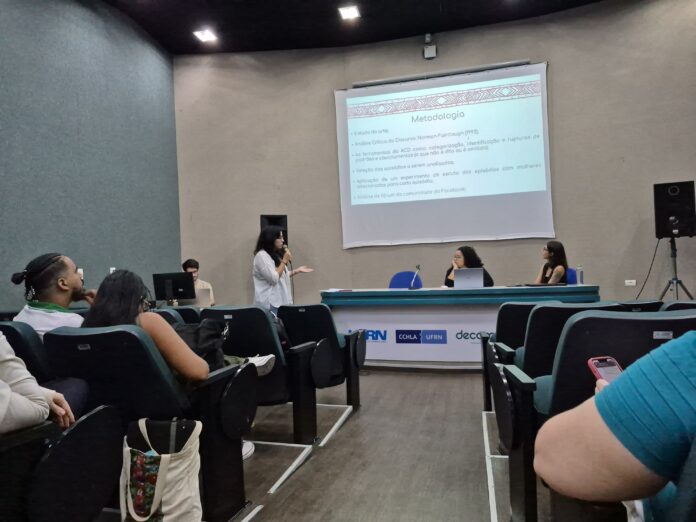 A mestranda do PPGEM, Lara Alves, expôs o seu trabalho intitulado “Girls on Grid: Representações femininas na série ‘F1: The Academy’”. A estudante relatou ter sido inspirada por sua paixão pelo automobilismo, a qual contrasta com a falta de espaço destinado a diversos grupos sociais, especialmente às mulheres.