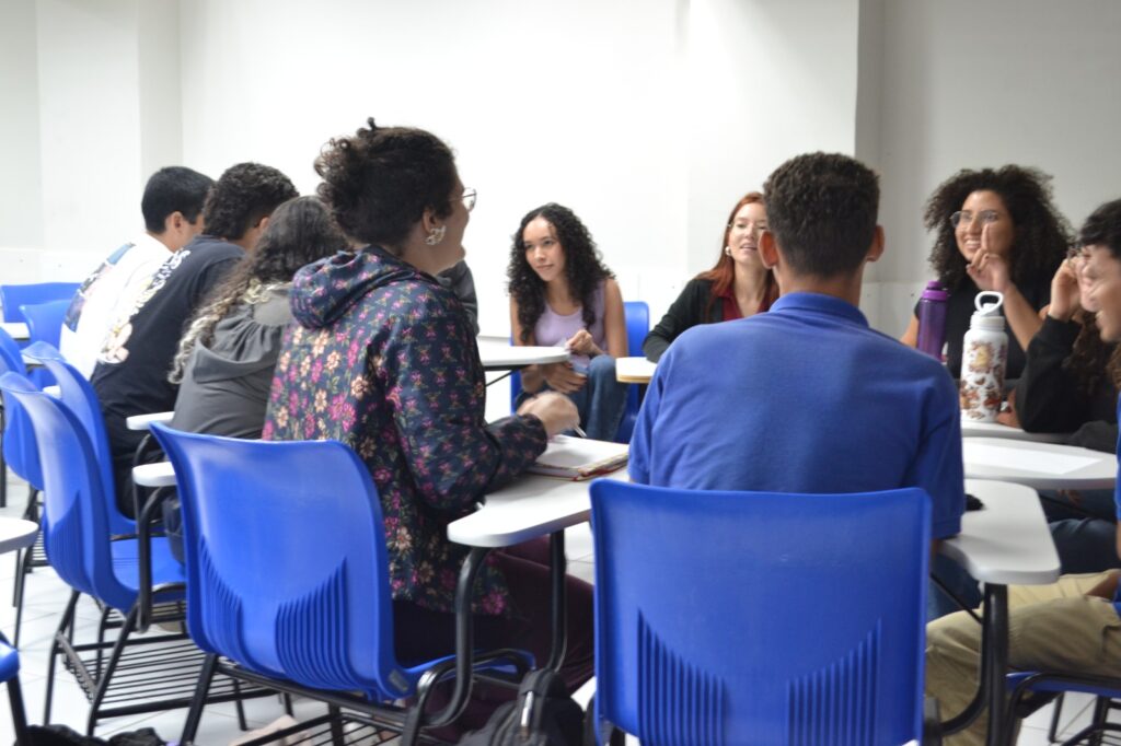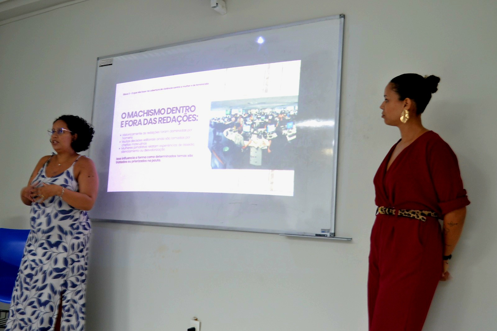 Na quinta-feira, 19 de março de 2026, no penúltimo dia da Semana de Comunicação (SECOM), Cecília Costa Medeiros do Nascimento e Francisca Pires dos Santos Neta, ambas do Programa de Pós-graduação em Estúdios da Mídia (PPGEM) ministraram a oficina “Da manchete à memória: oficina de boas práticas na cobertura de violência contra a mulher e feminicídios”, na sala 07 do Departamento de Comunicação (DECOM).