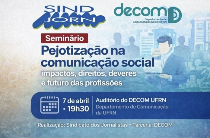 As transformações nas relações de trabalho na área da Comunicação Social estarão no centro de um debate promovido em Natal na próxima terça-feira (7). A discussão acontece durante o seminário “Pejotização na Comunicação Social”, marcado para as 19h, no auditório do Departamento de Comunicação Social (DECOM) da Universidade Federal do Rio Grande do Norte (UFRN).