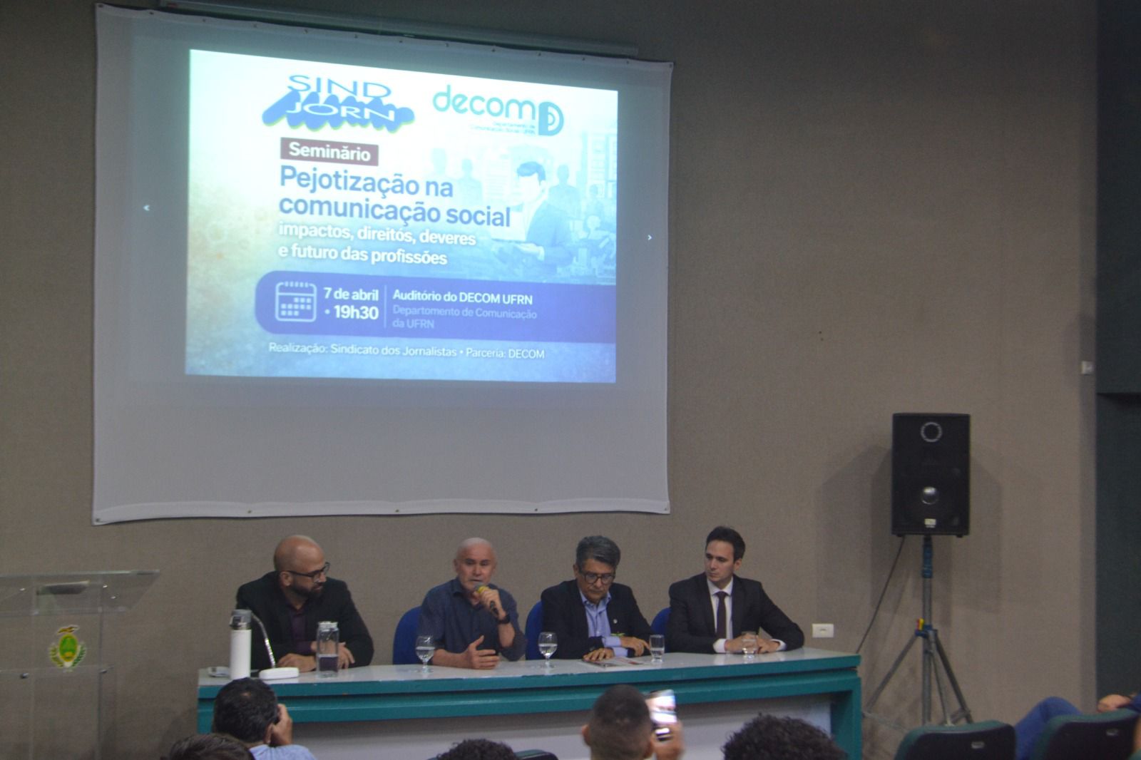 O diálogo sobre a pejotização na Comunicação Social aconteceu nesta terça-feira (07), no auditório 1 do Departamento de Comunicação (Decom), reunindo o superintendente regional do Trabalho e Emprego no RN, Cláudio Gabriel; o presidente da Comissão da Advocacia Trabalhista da OAB/RN, Faber Mesquita; o assessor jurídico do Sindicato dos Jornalistas do RN, Rodrigo Gerab; e o professor José Zilmar. Também contou com a presença dos organizadores, o professor Francisco Duarte e o jornalista Alexandre Othon.